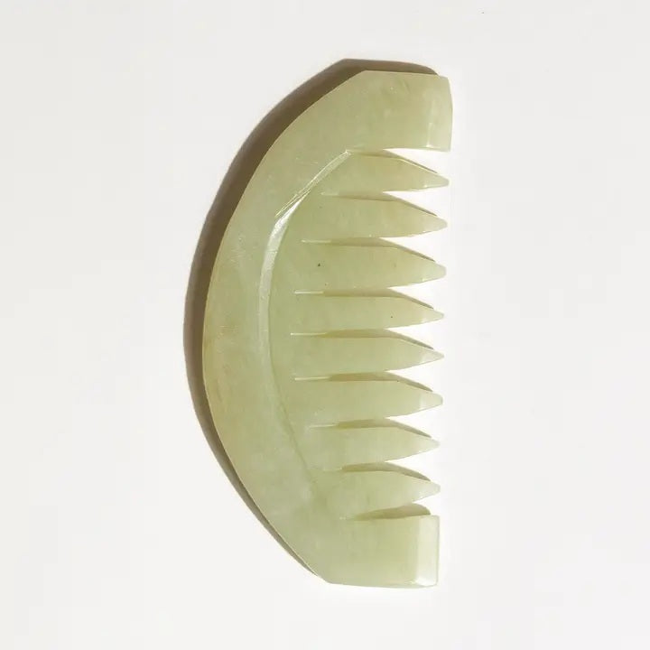 Hand-carved natural jade stone scalp comb. This comb is designed for microcirculation & relaxation while improving blood circulation and helping ingredients penetrate more deeply and efficiently into the scalp. *Please note that each comb is hand cut from natural jade, so expect ranges in color from a dark green to light green.